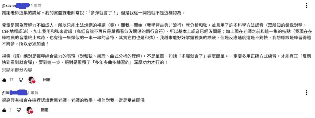 從鋼琴獨奏,鋼琴教育到德文藝術歌曲伴奏的學習經歷,讓我了解到不同領域的不同視角。尤其是語言的學習,還好當初有下苦功學習德文,才有可能除了自己的留學經驗以外,直接閱讀鋼琴教育學術相關的德文第一手資料,對【如何教鋼琴】這個領域,進行更深入的研究,並把成果分享給大家。
