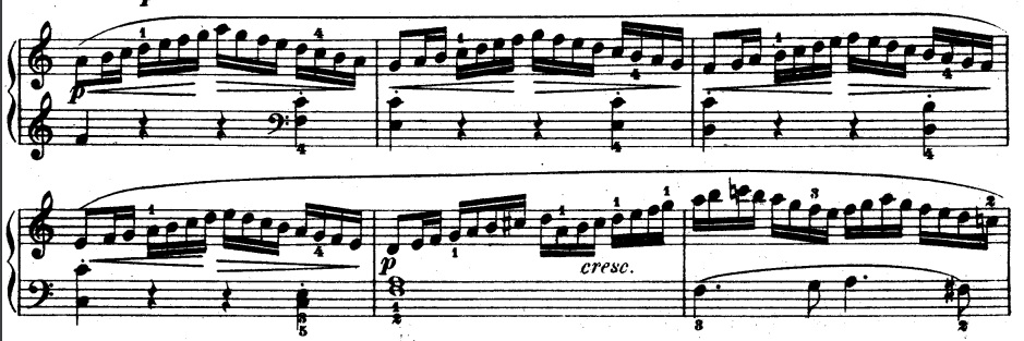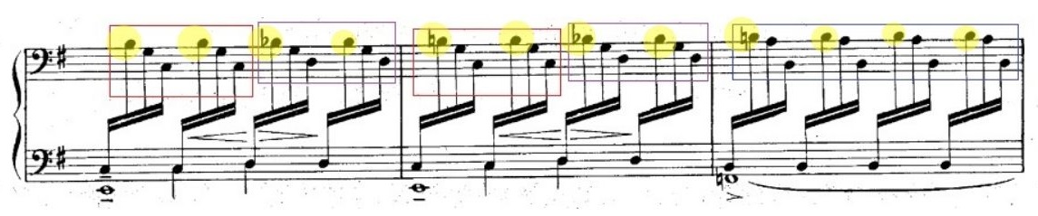 右手的部分,除了框起來的地方,兩拍的音相同之外,一整行右手的高音都在B與降B間轉換。有鑑於 B或降B是最高音,可以都用右手第5指來演奏,把其他手指留給較低的音使用。符合同音同手指,儘量減少位置移動與適合手型的指法安排等原則。