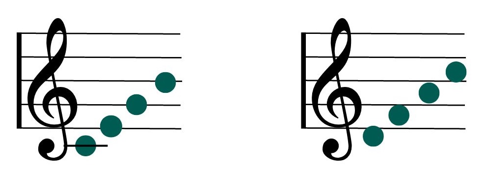 分為兩組。 左邊譜例-線上的音(從左到右,從低到高): Do,Mi,Sol,Si