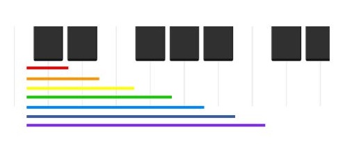 粉紅色的線是同音,藍色的線是移動的地方。視譜的時候,就是隨線條變高變低,讓手指在琴鍵上對應移動。高音往右邊移動;低音往左邊移動。將譜的上下維度 轉譯為琴鍵的左右方向。